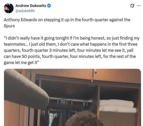 至于为什么选择抛投,爱德华兹解释道:“文班他太高了,哥们,他能封盖一切,他的脚步还十分灵活,他是独一无二的球员,所以我如果出手投篮,他一定能够封盖我,所以我只能突破。”