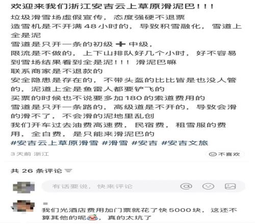就在上个周末,去浙江安吉“云上草原”滑雪的游客纷纷表示“被坑惨了”。因为气温过高、客流量大等原因,融化的雪道让游客们的体验大打折扣。云上草原景区不得不发出道歉公告,并承诺补送给游客们一张两日滑雪票。
