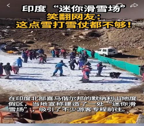 在一众 “避雷” 帖 里,有人幽默地翻出 近期登上热搜的印度滑雪场 。在印度北部 默纳利,有商家打造了一个迷你滑雪场,实际体验和宣传相去甚远。所谓滑雪场面积不足200平米,四周是光秃秃的土坡,雪层薄到露出了黄土。而门票价格也不低,需要500卢比。
